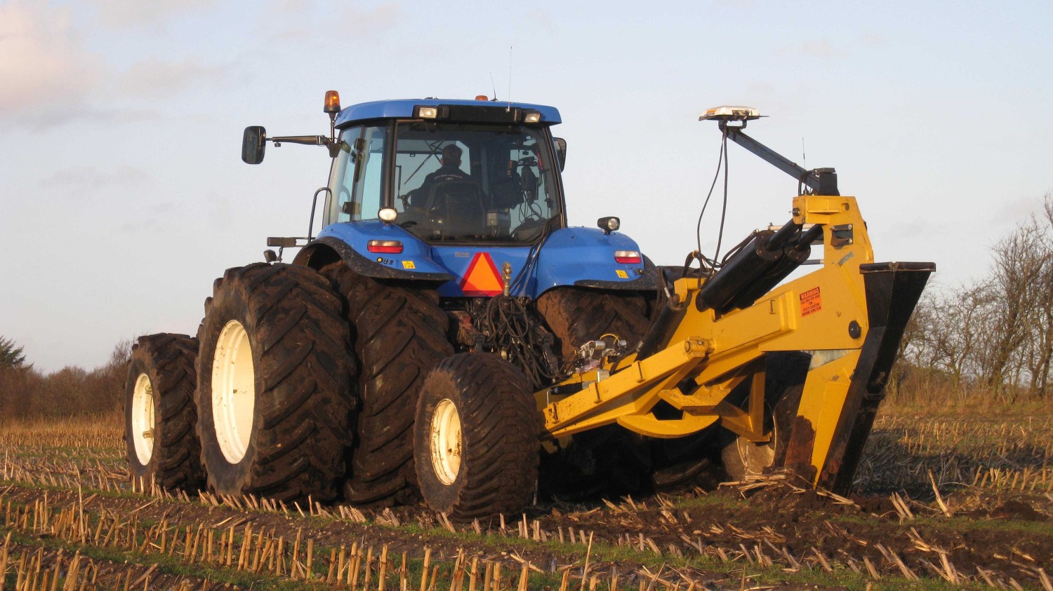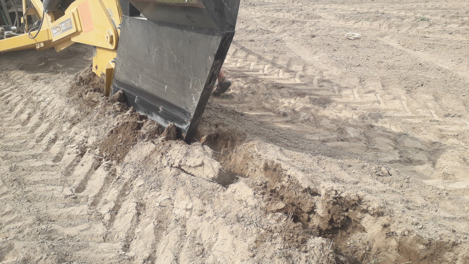1. Kõik vajalik drenaažipaigalduseks: Soil-Max drenaažisahk koos Ag Leader Intellislope GPS juhtimissüsteemiga, ekskavaator ja personal. Keskel jookseb taamale eelmisel päeval paigaldatud kollektori jälg.